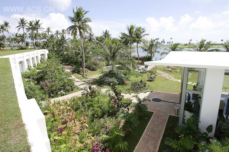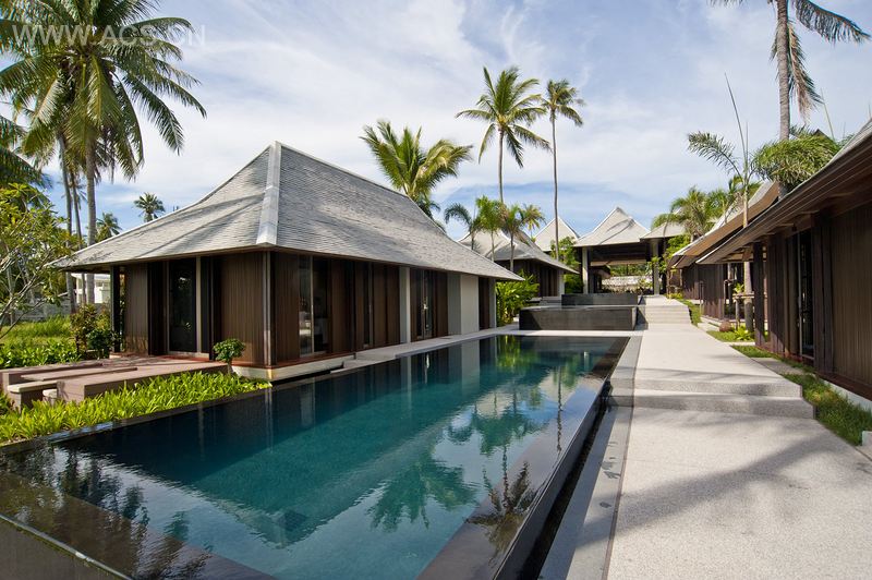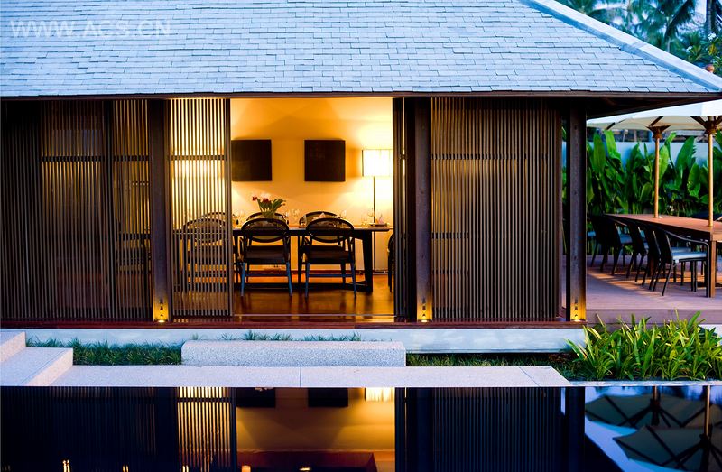 此水疗度假村的特色包括:自然通风,高舒适度,以及可滑动的垂直百叶屏风。屏风源于日式设计,环绕于各空间周围,既满足私密要求,又无碍观赏外景。垂直而立的屏风成为建筑的最大特色,加上葱郁的花园、高而斜的泰式屋顶,再经清水池的倒映,最终呈现空灵的光影效果。