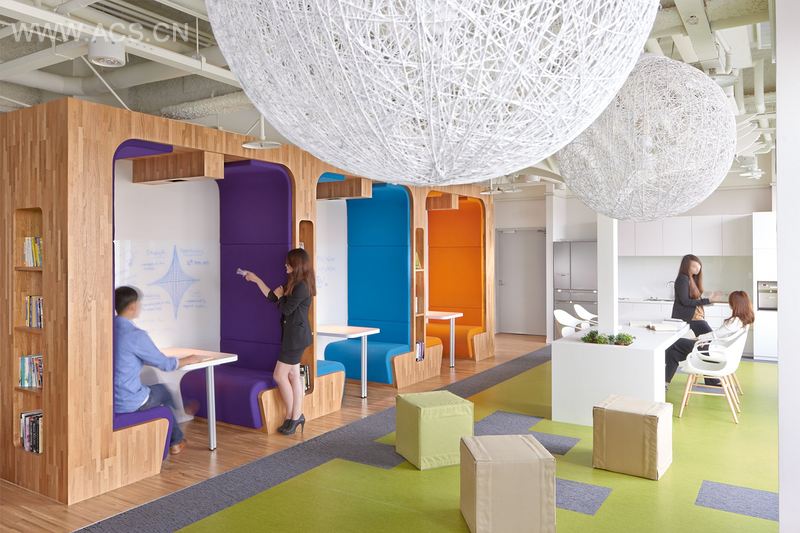 工作区域的特色是120度的工作站,鼓励员工之间的合作。会议室分散在工作区域中,有开放式的也有闭合式的。其中有一些是为特定的团队设计的,例如为市场营销部门设计的圆柱形集思广益会议室。其他一些突出的设计包括配备立方体座椅的大厅,椭圆形的员工餐厅和有着木甲板的外部露台。