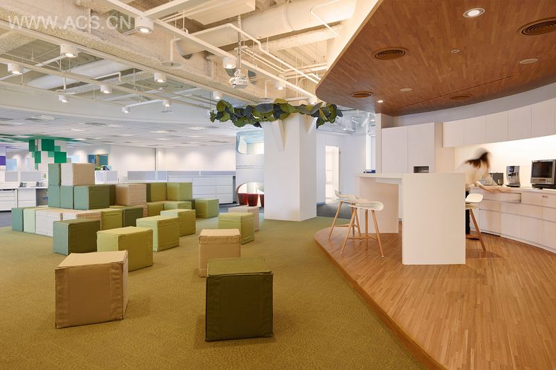 为了激发员工的创造力同时展现MSD与健康相关的业务形象,“自然”的主题贯穿本案的空间设计。从材料上来说使用了木地板,从美学上来说,应用了一块块如同绿色草皮一般的地毯和树状的柱子。设计同样强调了良好的自然采光。