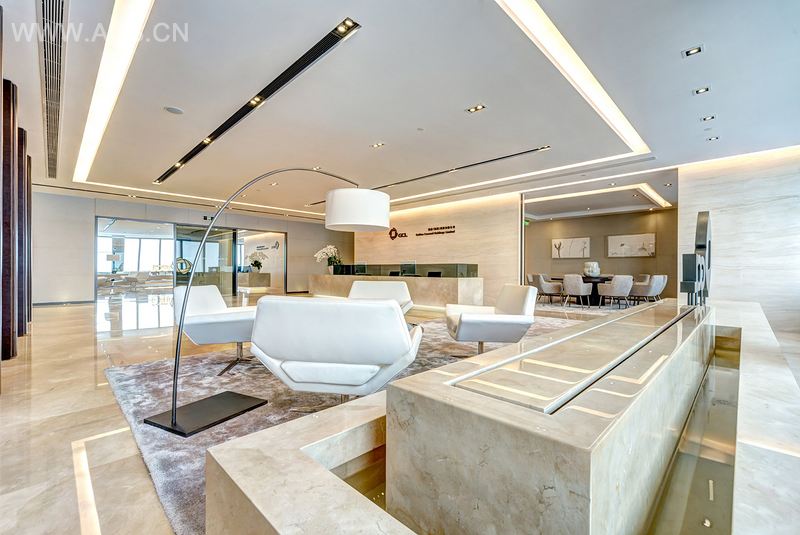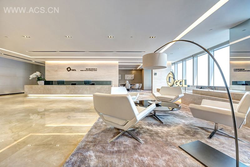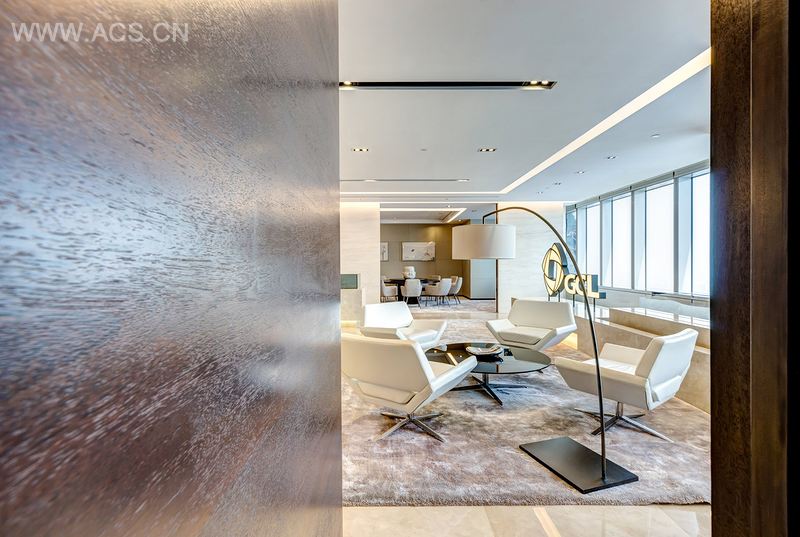 在接待区除了有着公司LOGO墙外,美丽壮观的黄浦江景色扑面而来。设计师使用了奶油色大理石和地毯作为主要材料,与深色的木饰板形成对比。整体环境显得精致而现代,同时具有中国味。自动滑动门通往紧挨着等候区的餐厅。董事会议室的设计主要使用了深色木材表层和深褐色的皮革,浅色的地毯和奶油色的墙板软垫给空间增色不少。自助餐厅则更为舒适放松,由长吧台和长条座椅组成。
