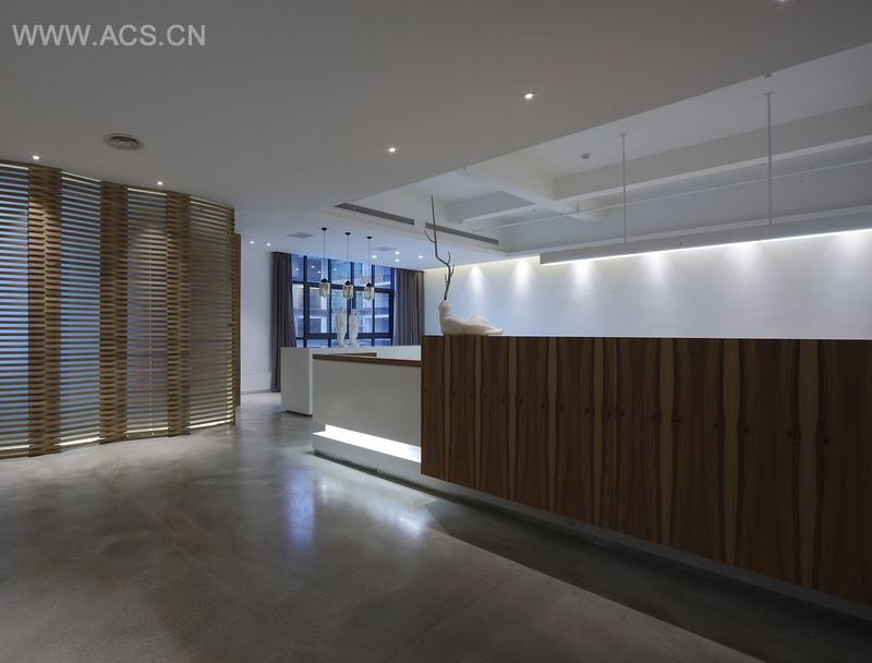 整个空间以白色为主,搭配自然的木色。一道互相重叠的原木造型墙,作为走廊、会客室、会议室的空间区隔,既开放又独立。敞开办公区一条白色的长吧,使主管位相对独立,又使原本比较严肃的办公区域变得轻松、休闲。