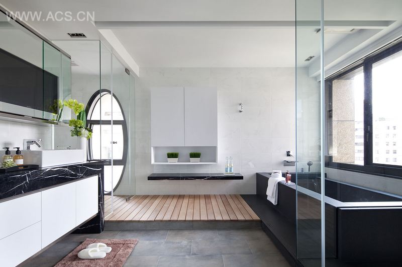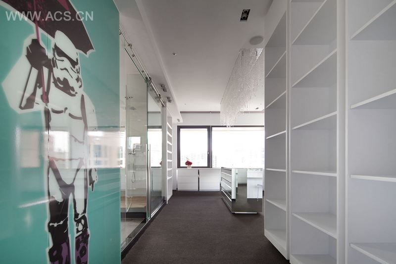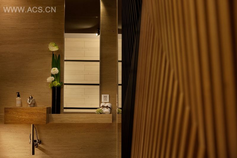 光线丶动线与质感的品宅为设计概念。折角木格栅划分不同空间,客厅走到淡金色不锈钢天花置入银河般的光纤。电视墙凿面理石面以黑铁分割,是一黑白的线性空间,另一端壁炉墙面马赛克与鳄鱼皮纹则是感性的堆积。主卧室床头墙延续公共空间造型,转进更衣间,可见Stars War pop art,天花板上是Swarovski Crystal Lamp,主浴室用南非理石,搭配实木地板。