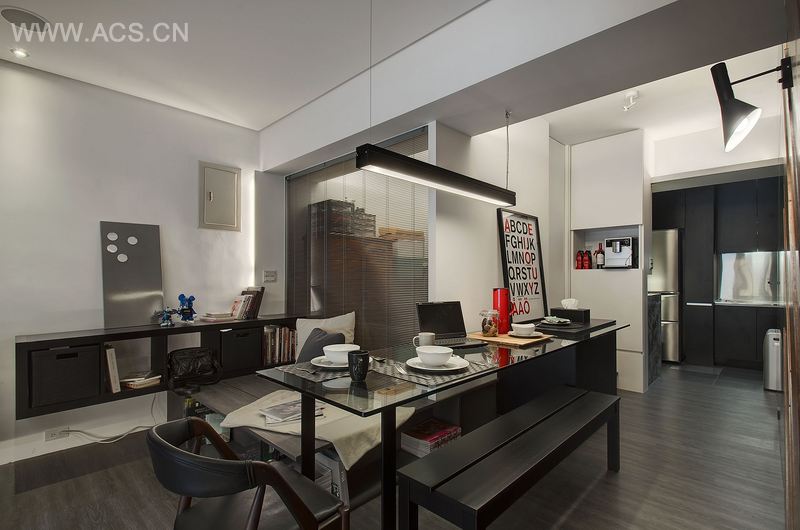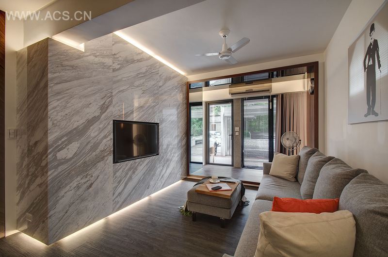 一楼空间因采光不足,藉外推阳台争取自然采光及更宽敞空间。客厅以银狐理石墙面展现质感,餐厅则采用实木表现,理石纹理和木纹构成一个V字型墙面,利用材质与颜色连续面视觉延伸,整体色调沉稳内敛诉说家稳定且安稳的力量。餐桌安排在通往厨房的走道,利用透明强化玻璃的材质降低了餐桌存在感并且将餐厅融合在家庭核心空间。