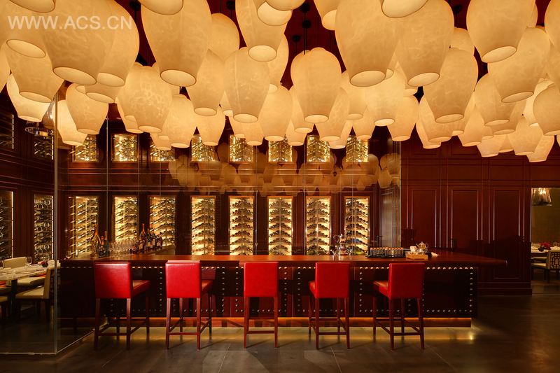 设计灵感来自于东方理念,整间中餐厅有多重体验区域,从入口到吧台和酒吧区。酒吧区的特色是定制的天花板,传统的中式酒壶形状的灯具提供照明,以及墙面明亮的酒柜。
