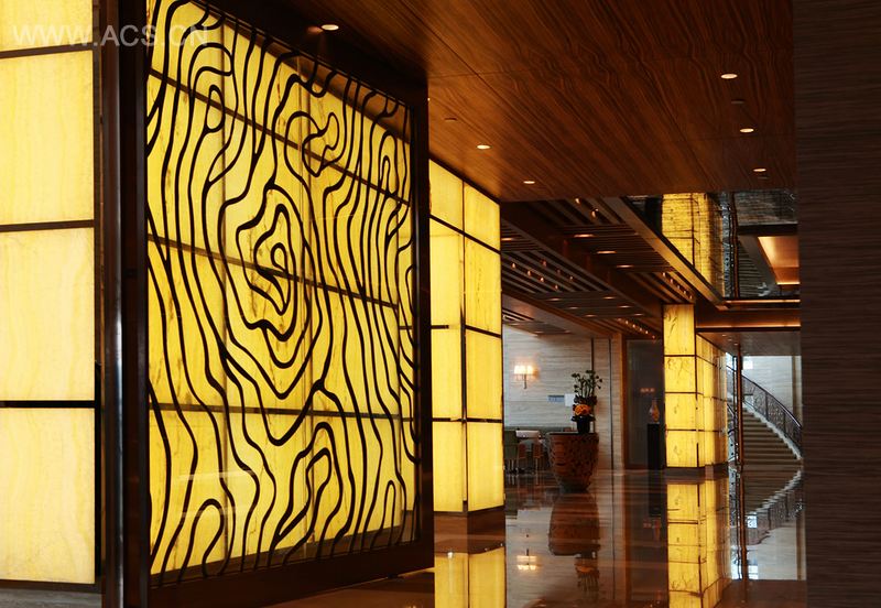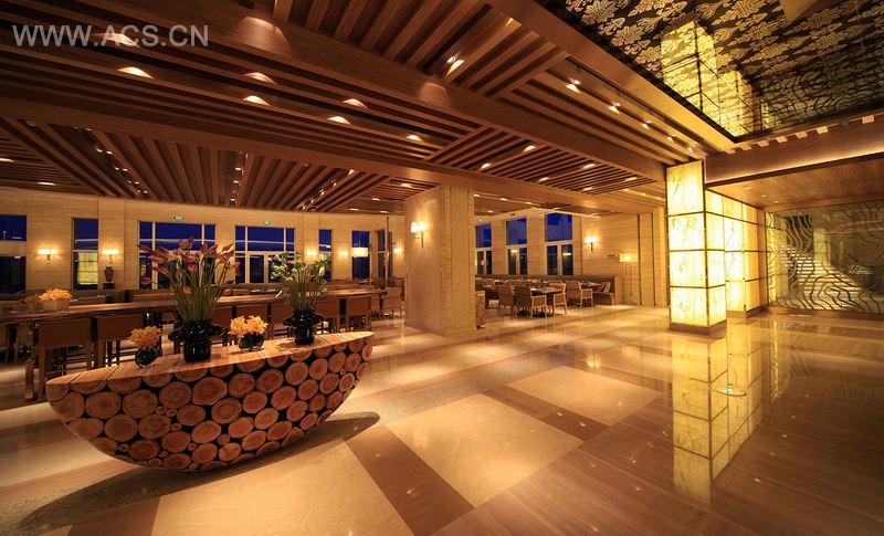 壹咖啡中餐厅位于杭州千岛湖希尔顿度假酒店的湖畔,面积为 1 190 平方米,包括 2 间贵宾室和众多舒适座椅。四周以水环绕,餐厅两层的体量结构被美丽的湖畔景致填满。因此,空间的延伸看起来效果惊人,人们可以尽情享受美丽的湖畔景致。餐厅的室内主要使用了木质家具,明亮的墙面顶灯提供了充足的照明。热带雨林大理石桌面与长桌及木质餐桌上木头的年轮相呼应,让整个餐厅充满原始的自然景致。各种食物配合美丽的湖景,唤起人们享受自然的广阔和美丽的感觉。