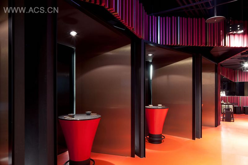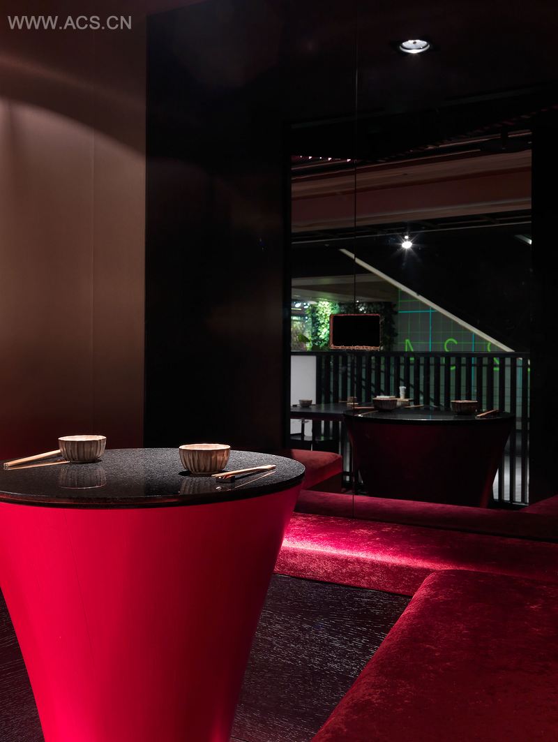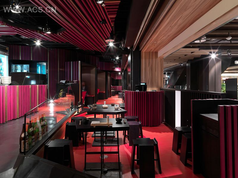 TBDC将主要吧台规划在主要的入口处并架高,让消费者在逛街的过程中,能够清楚且近距离看到食材的熬煮过程。巧妙利用家具的不规则摆放,消除既有空间狭长及纵深不足的问题,让座位分区有更多的可能,同时营造出空间的高低层次。所有的材料及色彩计画,搭配重点照明的运用,其重点皆为衬托食材及商品特色,强调场所的精神,同时避免喧宾夺主。