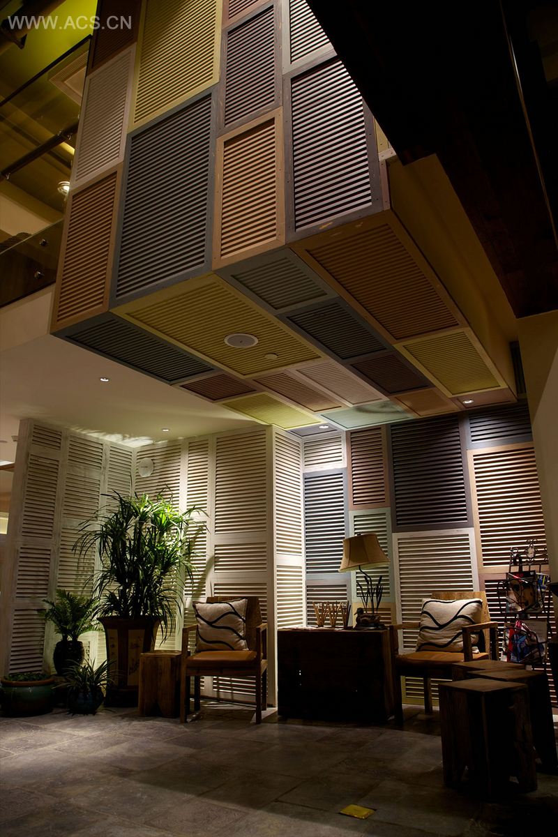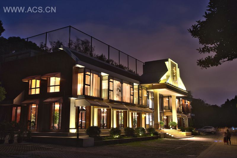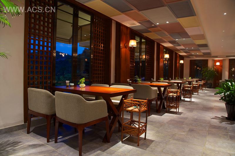 本餐厅坐落在山岭景区,设计师将原本平淡的外立面进行立体改造,并在室内做了剧院式的错层结构,能清晰地欣赏到外面的山岭景观。用百叶窗装饰的入口,将人们的视线拉升到中空的至高点,几何图形的切面隔断,让本来冰冷的钢板成为温暖的图文。中间区域特别定制的十人长桌和禅意的墙绘,抓住了空间的心弦,整个餐厅既融入自然的环抱中又独立其外。