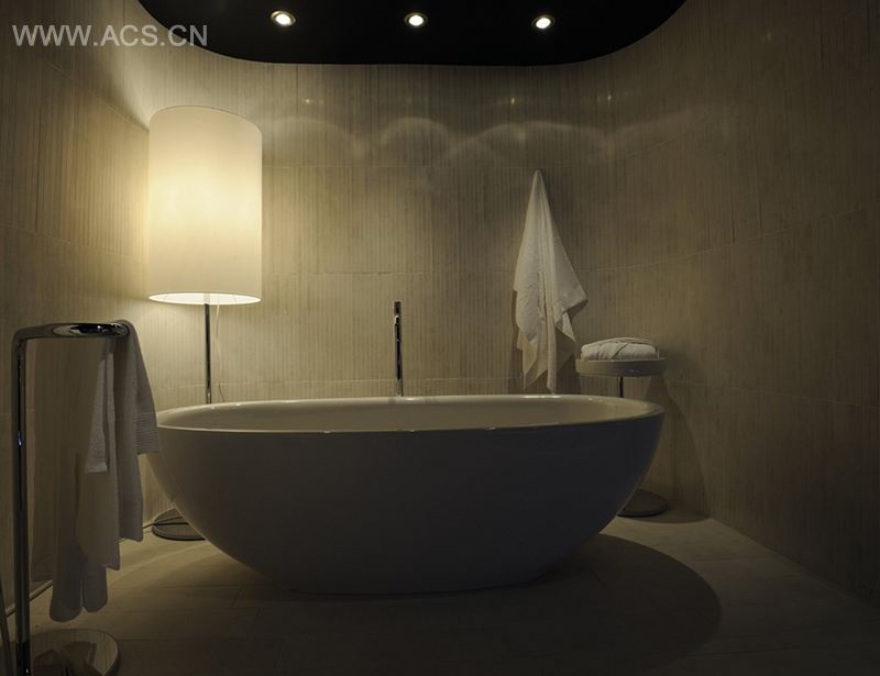 从空间几何方面看,水疗馆的一个重要元素,是大型的家居摆设,包括有机玻璃制成的桌子和床,以及中心区域的定制按摩浴缸。水疗馆优先选用的是天然材料。空间的色调以舒缓的黑色和蓝色为主,营造出无限的空间感。超大的有机玻璃床,极富浪漫色彩,能让结束沐浴的顾客,在这里好好放松一番。