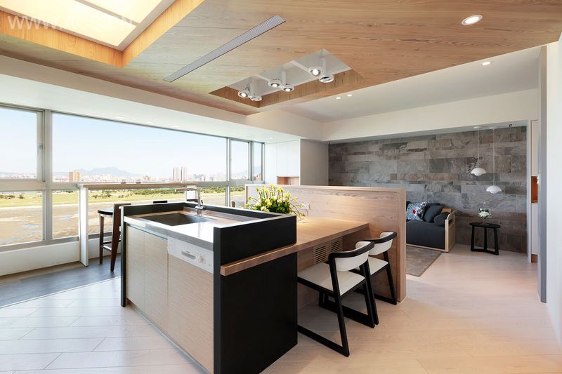 “从年轻奔波到现在,还真没有好好地看过故乡的这片土地,在永和河岸边长大的我,一直认为这是台湾最美的景色之一,我累了,最美的景,留给人生最后一里路的我!”设计师这样的概念理想,让环境、空间与家人有了完美对话。而既要揽景入室,首先必要破除卧室及厨房的切割,打造出大面积窗景,进而公领域机能整合,让一家人的相聚时刻有了最美好的记忆风景。