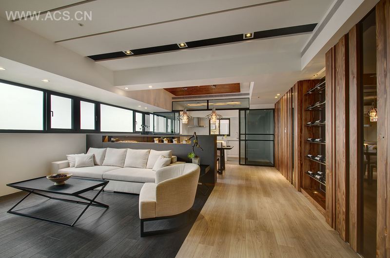屋主本身喜欢现代感俐落的设计,搭配上这样一片充满景观与阳光的窗景,所以在风格设定上,以大量的几何立体线条来呈现,色调也以白色来凸显空间的明亮感。但为了让空间还是拥有家的温馨感,所以加入浅色的木质材料来增添温暖的感受。另外,屋主喜爱钢琴而始终无法完成这个梦想,因此选用代表钢琴琴键的元素并利用拨动琴键的概念来贯穿整体空间。