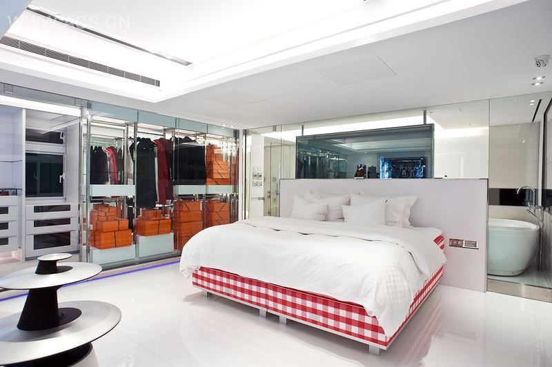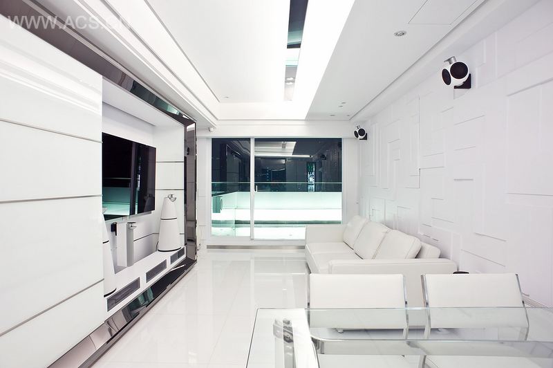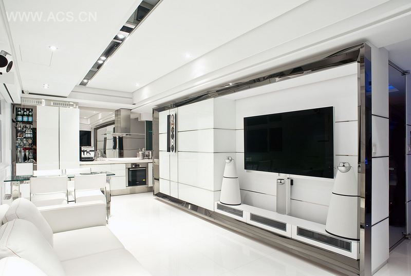 从简单利落的白色积木型层次的烤漆玄关的鞋柜丶墙面至走廊桌面一体呈现,凹凸方块L型集成墙连贯到客厅墙面,改善原本三间为一户T厅的狭长缺陷。利用钛金属板和镜面钢板搭配灰镜,超白烤漆玻璃折射拥有扩展空间效果。沟缝内藏LED灯条,作为(CRESTRON)自动色系灯控系统,融合了环保节能。