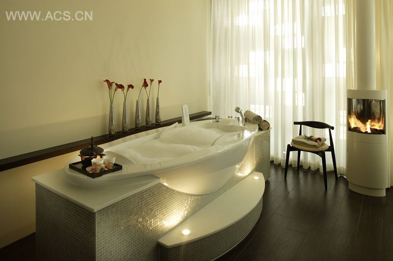 水疗馆的设计,很大程度上受日本风格的影响。湿蒸区域的足浴区,设有暖炉,顾客可以一边放松,一边品茶。在日式砂浴内,顾客可安躺于热卵石上,享受砂浴的保健护理,同时尽览苏黎世的峡谷风景。