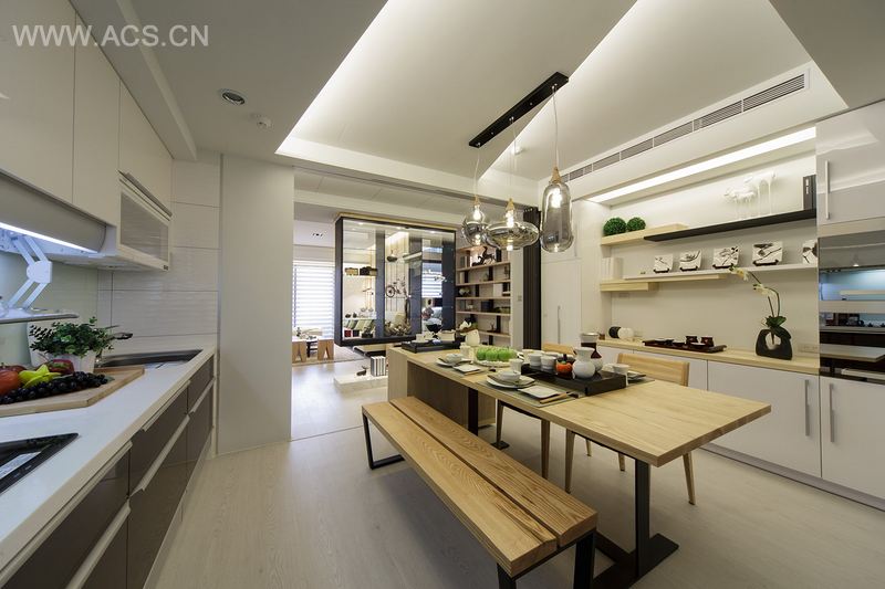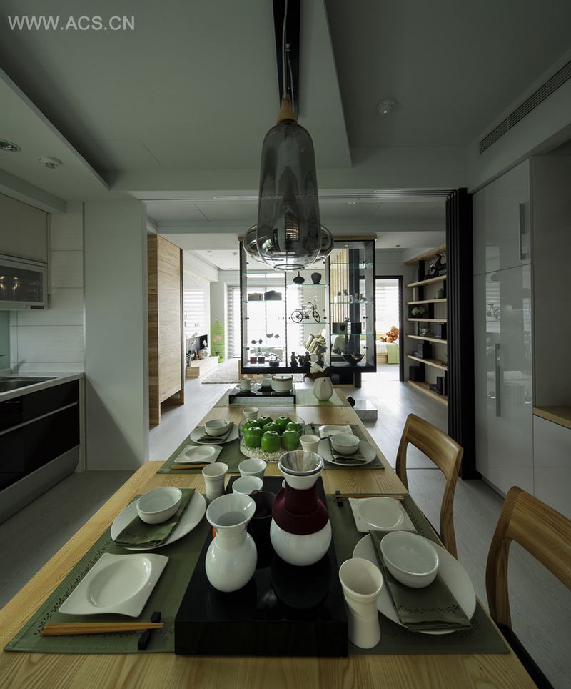 进入室内,一室雪白白橡木木地板,轻柔地带出温润的居家氛围。客厅区,以天然石材为基底,辅以铁件搭配梧桐木,巧妙地与餐厅隔屏柜及沙发背墙相互呼应,略带北欧简约风格。餐厅区天花板以摺纸的概念,透过光影折射,重塑空间的透净。空间感、光源与动线、机能,在光影投射下,人文与艺术结合,展演丰富多彩的空间语汇。