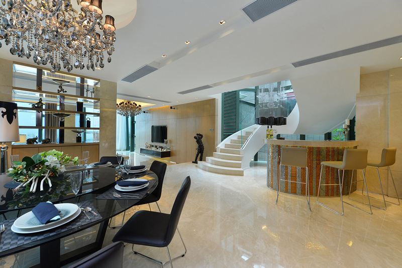 吧台,气派不凡。糅合物料间的轻重、透过色调的互相呼应,为色彩素雅的空间勾勒出层次感,沉实中渗透出华丽的气派。园林景致为家居增添清新细腻的感觉,散发恬静的自然之美。