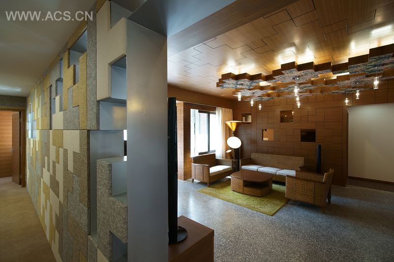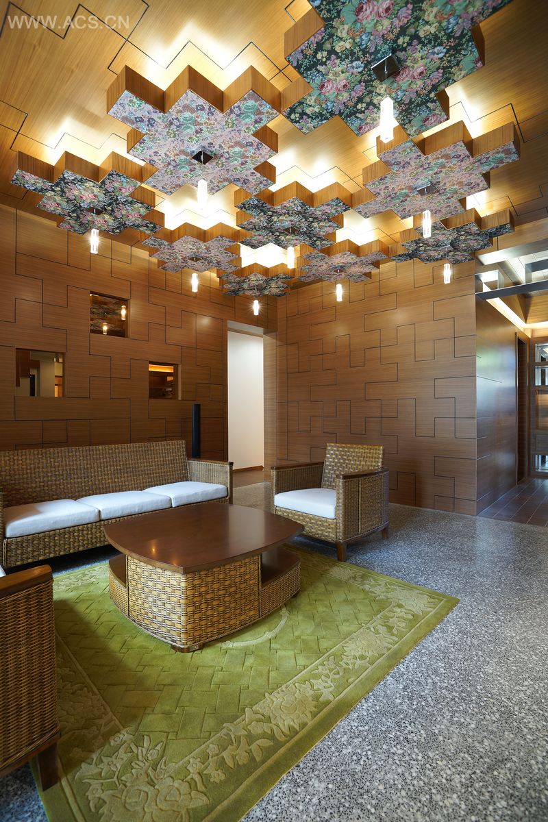 设计始于对业主及其宗教信仰的了解 —— 佛教以及佛教的代表标志“卍”。空间中有着无尽的“卍”衍生图形,从入口到起居空间再到楼上,出现在门上、天窗上、天花板上还有九个一组的吊灯上。这些吊灯的设置是出于风水的考虑,既是设计的创意产物,也是为了满足整体环境的需求。