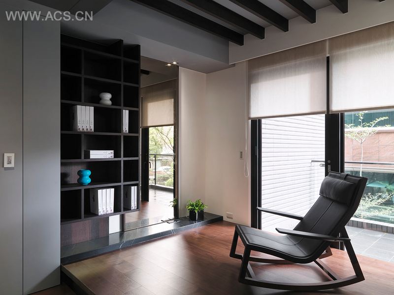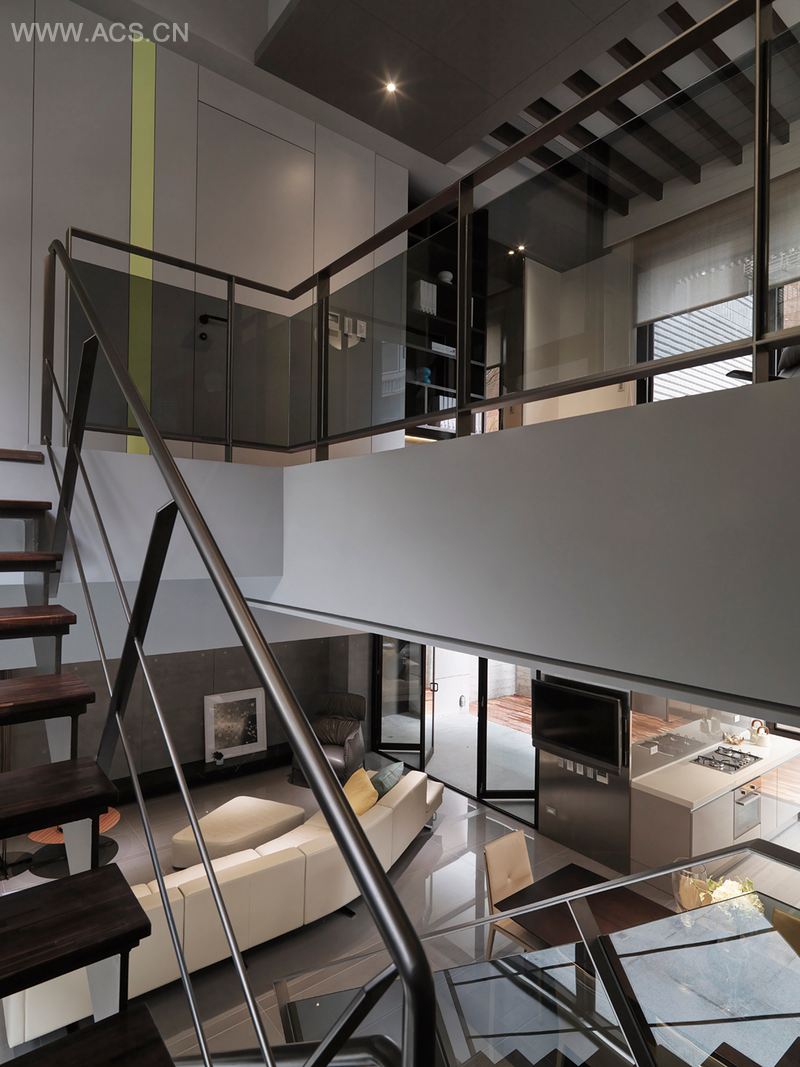 随着工业风格与几何线条交织的楼梯而上,惊见小小和室的暖性安插在现代的氛围中。