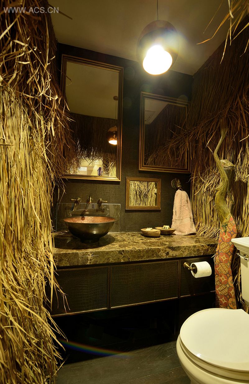 业主想要在盥洗室中呈现一些“野性”。她喜欢串珠,因此我们应用了珠状的灯具和巴布亚人头饰。业主带来了一些佛像,为了很好地安置这些物品,我们用投影仪取代了电视。