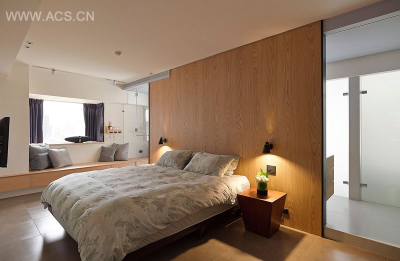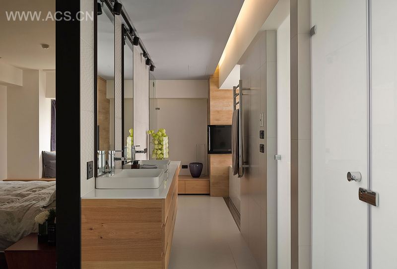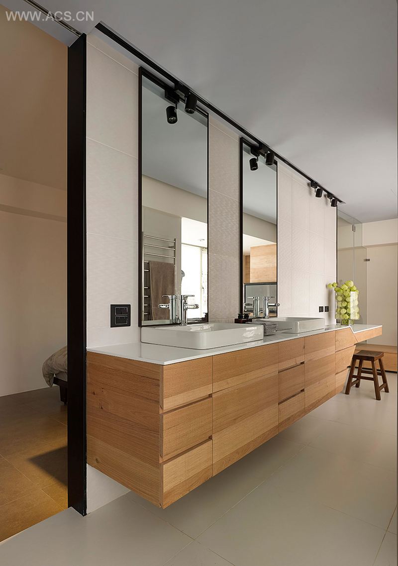 走进客用浴室,映入眼帘的是一整片酒瓶摆饰,背景为立体巧克力砖,客人使用浴室时,也感觉被容纳在这座舞台里。这屋子有一半的空间是后台,进入主卧室,采取双动线进入浴室及更衣室,浴缸、淋浴间、厕所相连隔间,则是考量日常生活便利性所做的贴心设计。屋主有绝对放松的休憩空间。其实,主角的一方天地再日常不过,唯独每当他要扮演招待朋友的主人角色时,这个家已是准备好的舞台。