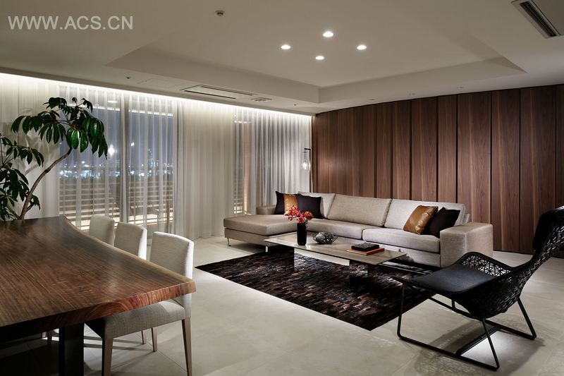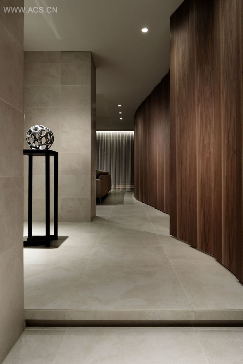 六本木住宅位于东京市中心,是当地地标。我们完成了其中一个单位的翻新设计。进入房间内,首先看到的是一堵木质墙,充满了韵律和具有视觉冲击力的曲线,这堵墙有着三方面的功能。第一,这些曲线成为整个方正空间中的亮点。第二,它包含了大量的储物空间。第三,邀请人们进入起居空间。在入口处往左看,能看到从洗手间到卧室空间,彼此通过侧滑门分隔开来。当这些门都打开时,空间成为连续的整体,视线通透无障碍。这项设计利用简单的结构和无阻碍的视线,营造出空间感。