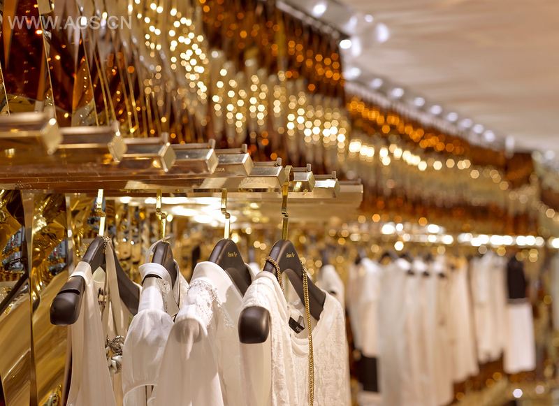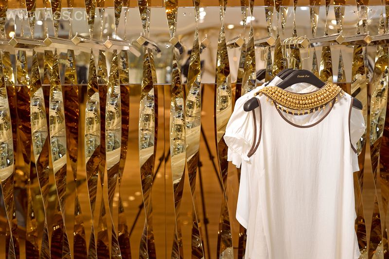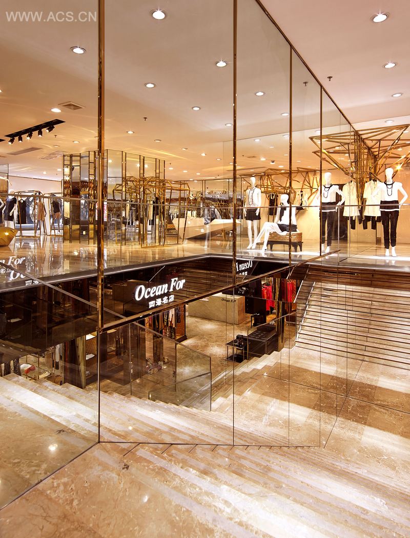 业主期望他的事业版图如大海辽阔,浪潮席卷全国。设计就此发想,以海洋为意向,运用各种材质及灯光,于空间中创造波光粼粼的海面风光。一楼以石材、黄铜营造出高级精品店的雍容气度。二楼墙面模拟阳光洒落海面的金色波纹,灯光与镜面折射,创造绚丽的光影变化。几何切割的展台,仿若海面上闪耀的礁石,转化为空间的视觉焦点,与品牌单品互映生辉,勾勒奢华的时尚氛围。
