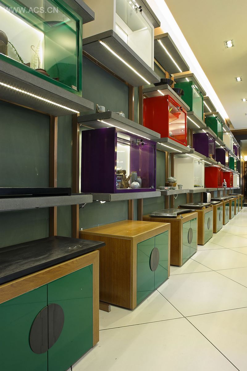 本案为商业卖场和品茗空间整合的一种中国茶文化,借用艺术手法显现。古朴的制茶器具和艺术陈列品,纯粹优雅的品茗区,让顾客感受意境之美。