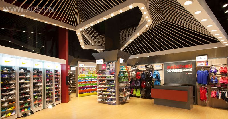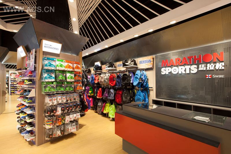 马拉松是一家销售各大品牌运动服饰的连锁店,设计目标为提升运动形象并改善产品分类的模式。因应店铺特高天花特征,设计由此开始以两个不同形状的环组成,而两个环之间有着 105 个转变中的倒转 V 型结构从天花连接起来,两者结合起来加上扭动的设计,勾画出人体在空间中活动的抽象韵律画面,令整个店变得更悦目生动,具有力量。