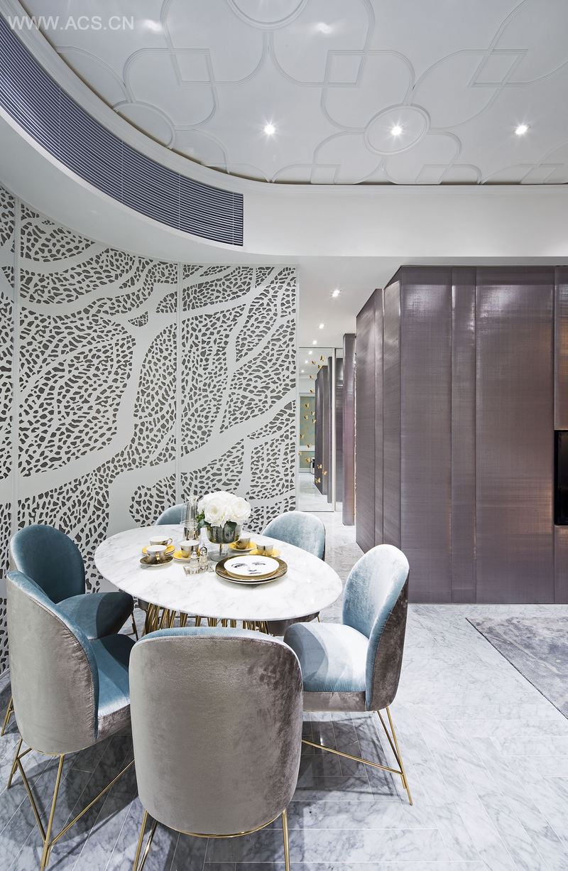 客厅与饭厅以具层次感的立体设计和安装精细花线打造的特式假天花吊顶;以弧形通花屏风装饰和特别设计的真假木门,优雅脱俗,为整体设计增添尊贵的气派。