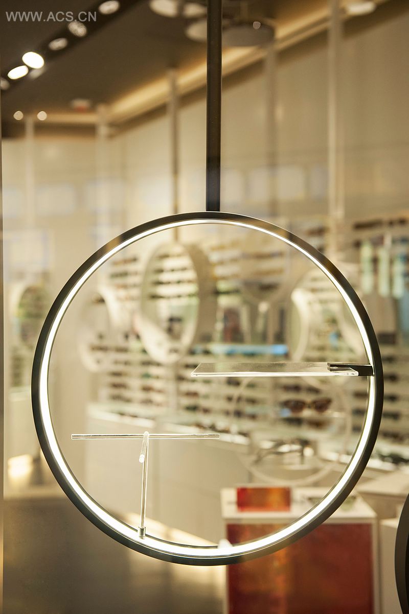 设计师将太阳的圆球形状,以及太阳镜小屋标志中的圆形运用在灯光、家具、产品展示及天花板处理方面。独具纹理的“图钉墙”成为店内的主要特色,由 29 000 个白色的 25mm 图钉组成。空间给人精致的整体感觉,黑白的品牌标准色增添了“明星般”的氛围。