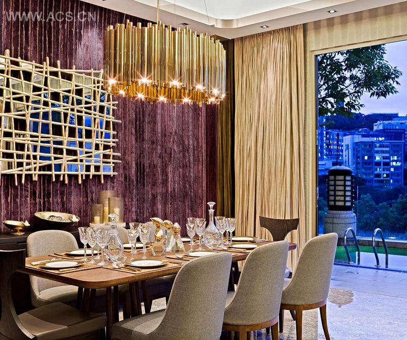 设计师为这间住宅选用了较暗的设计,这是一个相当大胆的概念。进入屋内,戏剧化的空间中一面暗紫色的墙和一面米黄色的皮革墙形成精妙的质感。用餐区放置了金色的镜子和金色的灯具,作为空间的亮点,同时与其下的木质家具形成对比。