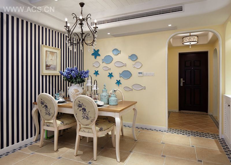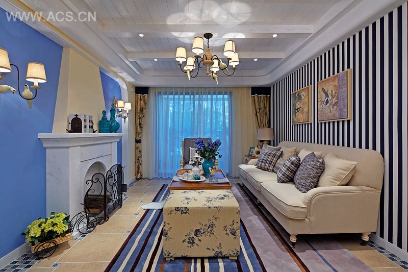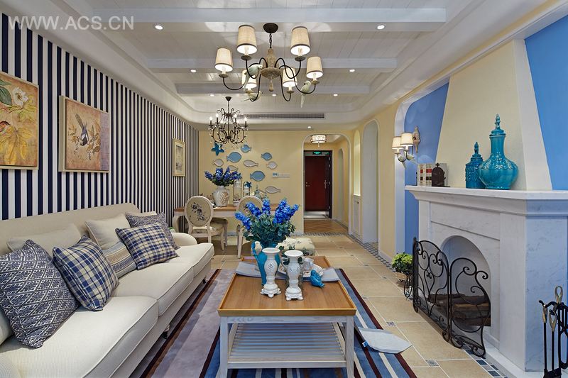 蔚蓝色的浪漫情怀是本案的灵魂。在空间主调上运用蓝、白、米黄三大色系。客厅运用有深浅蓝色系列的仿古马赛克拼贴走边、大地色的仿古砖、精致而富有地中海色彩的图案小花片点缀,为整个墙面做了华丽的铺垫。浪漫清新的地中海风情,让人爱上回家的感觉。