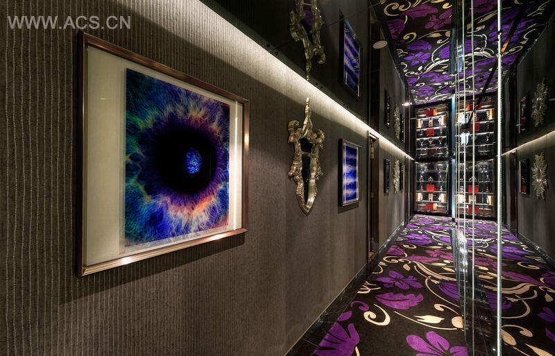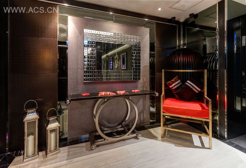 正门的特色墙由法国木纹云石与黑色镜钢拼凑而成,层次分明。会所的 LOGO 从灰镜中渗透出来,低调却不失气派。在家具及摆设选择上也颇具匠心,鸟笼形状的设计椅及灯具,为会所添上一个中式的小角落。黑色玻璃将门背、电视及影音柜等碍眼的设备隐藏,亦令房间空间感大增。设计师利用云石、黑色不锈钢及玻璃量身打造的茶几,成了会所设计的关键,糅合时尚与气派。