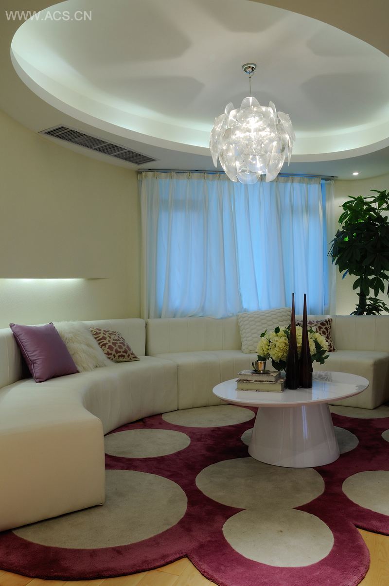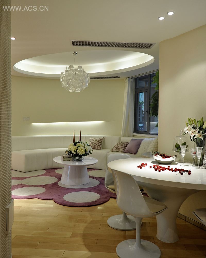 本案以弧形贯穿始终,消化结构凸起的同时,将视觉界面的展示和功能配置完美结合。从入口的餐厅和厨房,再到客厅和通往卧室的过道,整个公共活动区域的界线就像一根飘带一样,随性自由,柔美无比,让她自然的生长,自然的消失,空间本身实有界,但视线却无边。