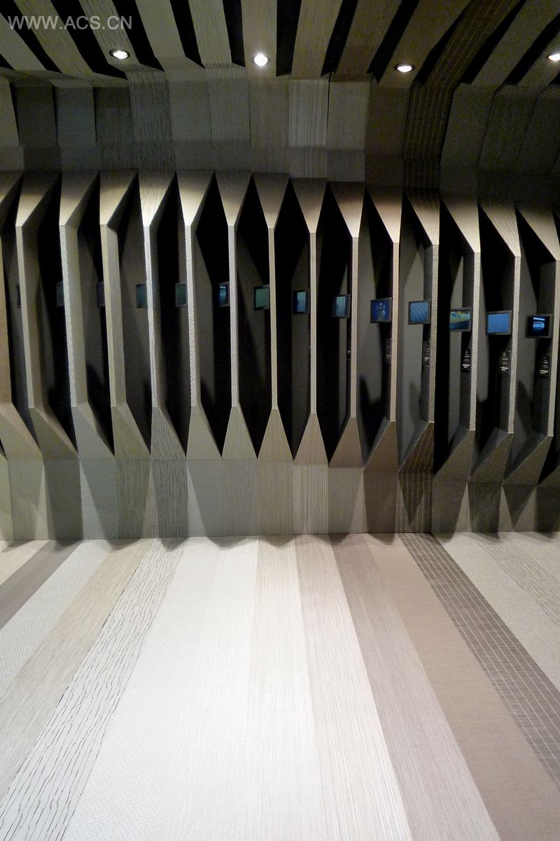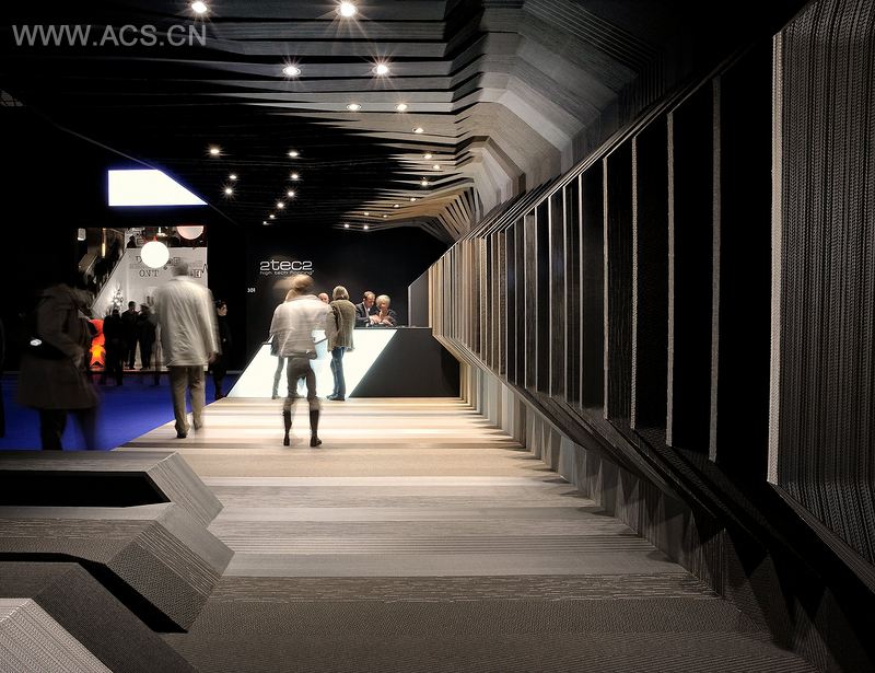 空间由40个 25厘米宽的条状带构成,每一条通过变形,弯曲,收缩,拉伸来实现以下功能:展示、交流、就座,桌子、办公台、灯光、贮存。所有的条状带沿着三角形正弦线的几何形态在空间中拓展,这些方向线使得整个空间更加结构化。这些条状带一边铺设地毯,另一边涂上黑色。这样几乎2TEC2的全部展品尽收眼底。