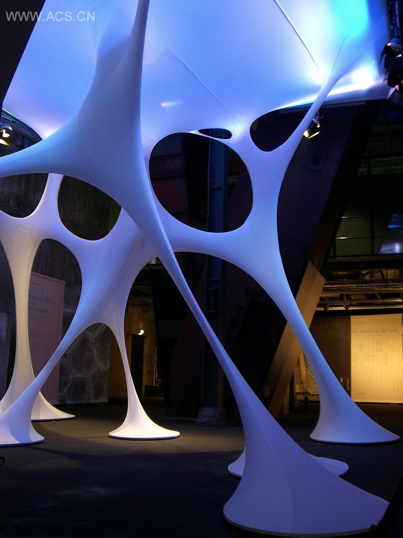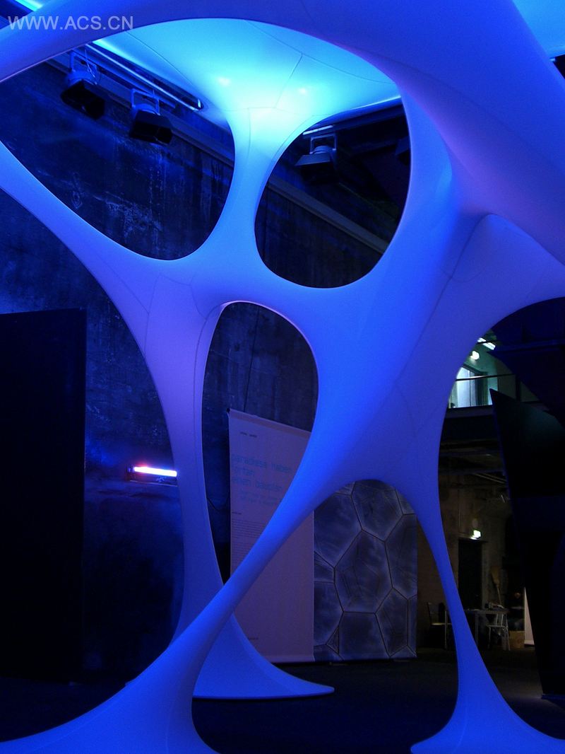展亭的造型没有经过明确“设计”,它更像是最有效的三维空间划分,源于自然,好比有机细胞,矿物水晶和自然生成的肥皂泡沫。这个概念的实现是通过运用灵活性材料,遵循重力,张力和生长,类似于一个蜘蛛网或珊瑚礁。