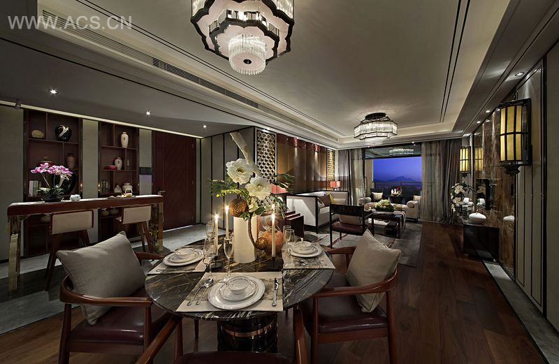 室内处处都摆放着设计师精心设计的陈列品,如家具、灯饰和挂件,陈列着各种精致的中国物件。这些物件与现代的设计在恰当的空间邂逅,让现代设计蕴涵着深深的中国历史文化印迹,让古老的中国艺术焕发活力。设计师对中国元素准确的把握、运用和组合,成就了一个具有东方文化底蕴,兼具现代时尚的样板空间。在传达尊贵大气的同时,让人切实地感受东方的人文古韵。在弘扬中华深厚文化底蕴的同时,颠覆传统,注入新的元素,温馨优雅的空间中透露出中式的禅意和朴实,空间中每个景致与角度都使人感觉到喜悦,使人拥有另外一种视觉享受,达到“寥寥人境外,闲坐听春禽”的境界。