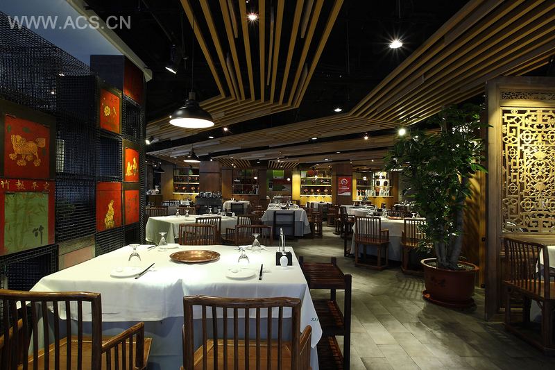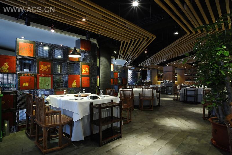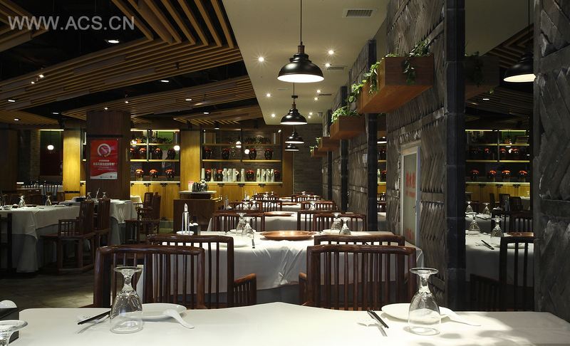 本案的概念定位为“集市生活馆” ,其特点是:场景化、丰富化、热闹化、体验化、平民化、融合化。“感餐”,即心里的味道。“集市文化”是大众消费,本身就有很强的亲切感、热闹感、体验感,都市生活的社会属性已远离的人们的自然属性,将自然引进生活,把集市、街的概念贯穿在整个就餐过程中,门头是集市的牌坊,门厅罗列了大大小小的木箱和金属笼子,使空间呈现玲琅满目的集市情景,每个木箱上都绘有集市的片段场景。通道和连廊有货郎车的车轮印迹,端景便是真实的货郎车,大面积的植物墙给整个空间带来了生机,两层包间都有不同街景的再现。用后现代的手法演绎传统的乡土气息。