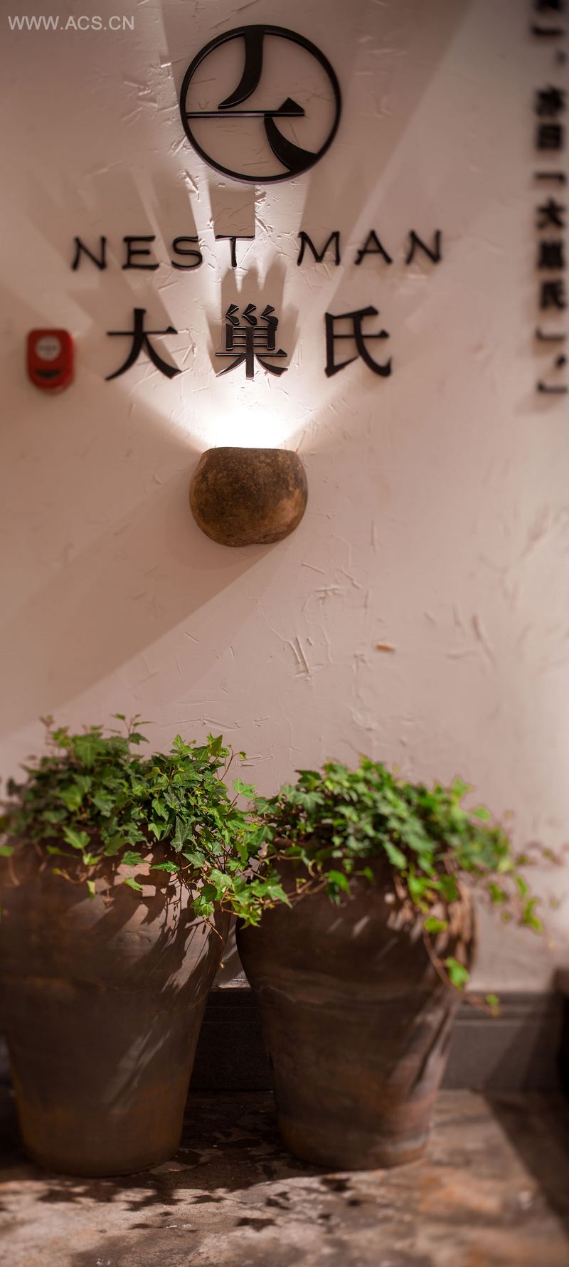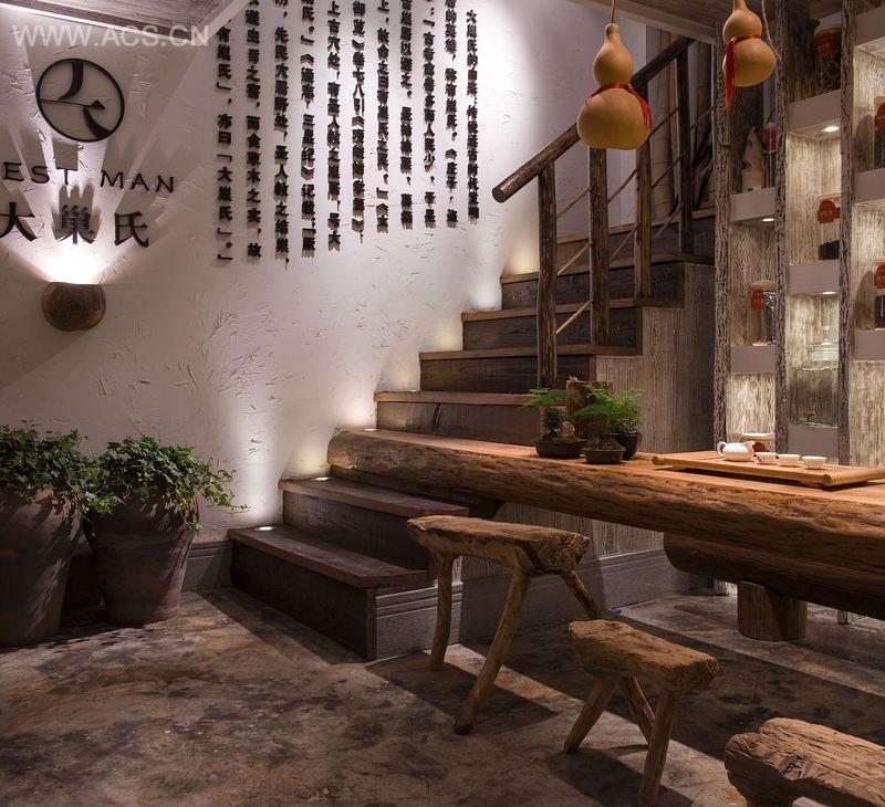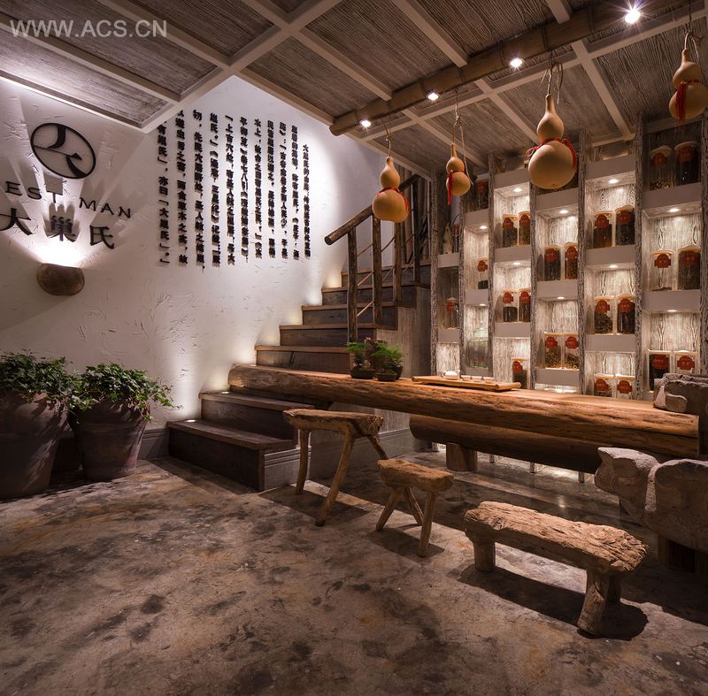 本案设计秉持自然养生之念,保持天然,让一切看起来都那么自然,不矫揉造作。原木、原石、竹子等自然材料,进行巧妙衔接捆绑,分割空间,又使之在情理之中 , 辗转回旋,烘托出整体环境氛围。入门处,本案设计师偶得三把凳子,全由树木自然生长而成,未经任何雕琢打磨,更好地切入主题。自然的东西如何保持良好的状态,这便是该项目追寻的真谛。吧台顶部倒挂的是官冒盒,与历史的悄然对话便在形影间完成。如此环境,走进去便像是得到自然的洗礼,身心舒畅,崇尚自然与和谐,方可达到最好的状态。这便是设计师所追求的,不娇柔做作,