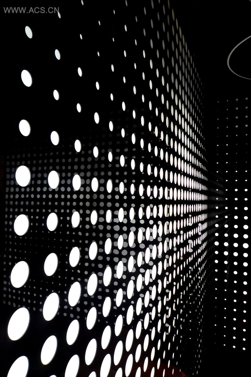 展览空间的墙体由背光照明,黑色面板通过激光切割形成圆状的渐变图案,这种渐变制造出连续变化的空间氛围。黑白相间的天花板式样与地面相衬。