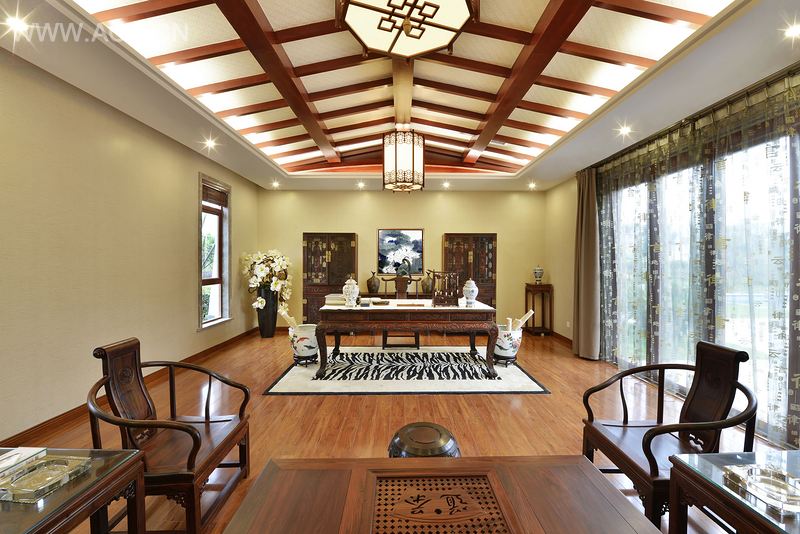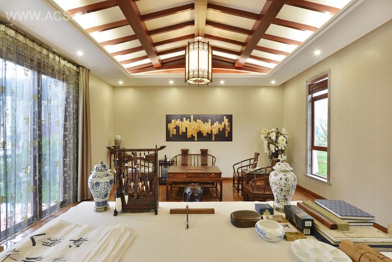 室内以现代中式装修手法为基础,以简洁大气为基调,突出功能的完备性,与美观融为一体。以面和线的形式来阐述设计语言,配以古色古香的家私来彰显厚重与非凡的气势,使得室内室外相得益彰,妙趣横生。