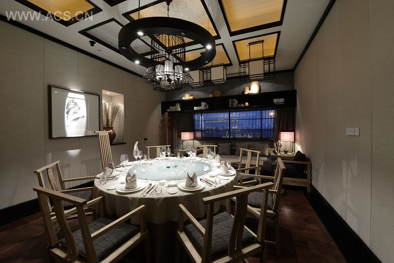 设计师不拘泥于传统的中式餐厅的严谨肃静,更愿意把它当做一个艺术品来对待,运用我们中国传统古朴的设计元素并且推陈出新创造新的设计元素,带来新的设计理念,融合餐厅柔和温暖的主色调,让人心里顿生一种皈依的宁静感。