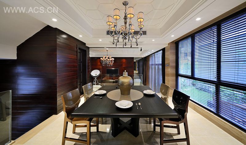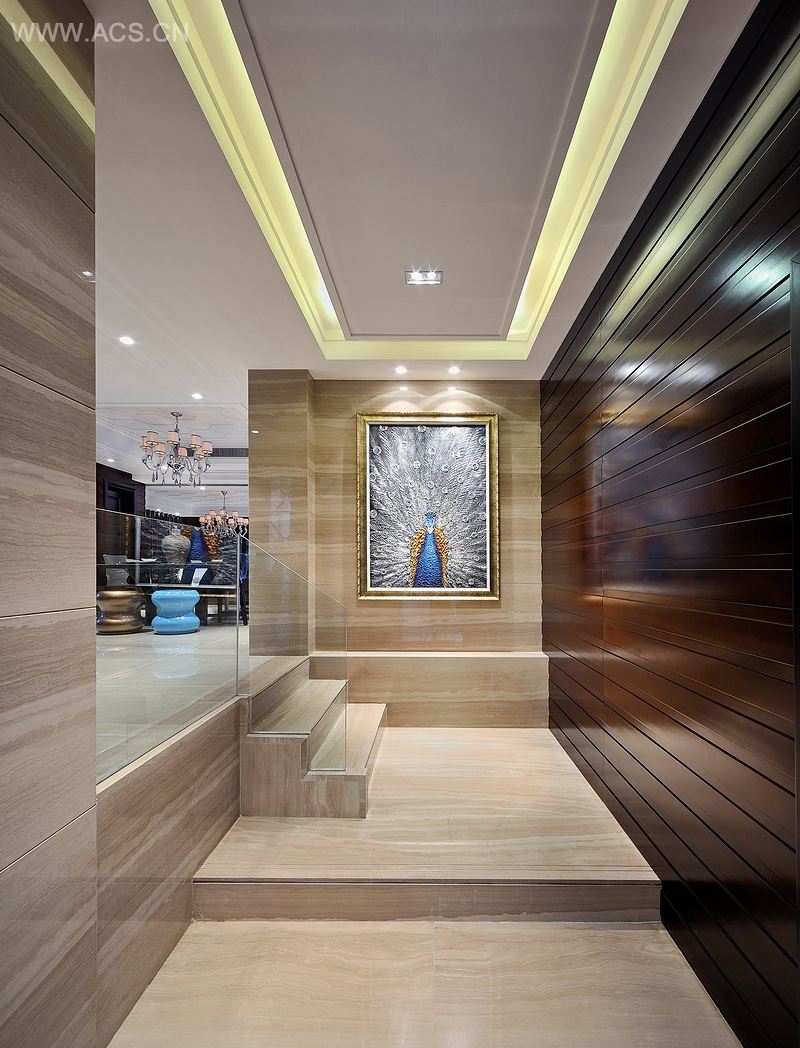 本案以低调的奢华为主线,将材料整体融合统一,让每种颜色材质都相互衬托,运用不多的颜色让居室有奢华的效果。木头是温润的,玻璃是婉约的,石头是刚毅的,三者处于同一空间时相互呼应,用不同的色调和温度来表达相同的设计语言,便能组合出别致的韵味。棕红色的面板与米黄色的大理石,在白色天花的衬托下突显出墙面的装饰性,而与之衔接的灰色玻璃悄悄的将空间复制,在视觉效果上扩展了空间面积。材质运用上最易让人忽略的楼梯处玻璃,也有它清澈透明独特的映射效果。对于不同的区域设计师有着独到的见解,用一些意料之外的铺成方式塑造空间的效果,设计不乏生活情趣和生活品质。充分烘托出该空间归属感、价值感和品位感。在空间的设计上,设计师主张让有限的空间发挥出最大的使用功效。从入户门厅到餐厅再到客厅,此起彼伏的错落处理,不但使得整体空间层次更加丰富,也使得不同区域有更好的相互联动,于无形之中提升了品位。