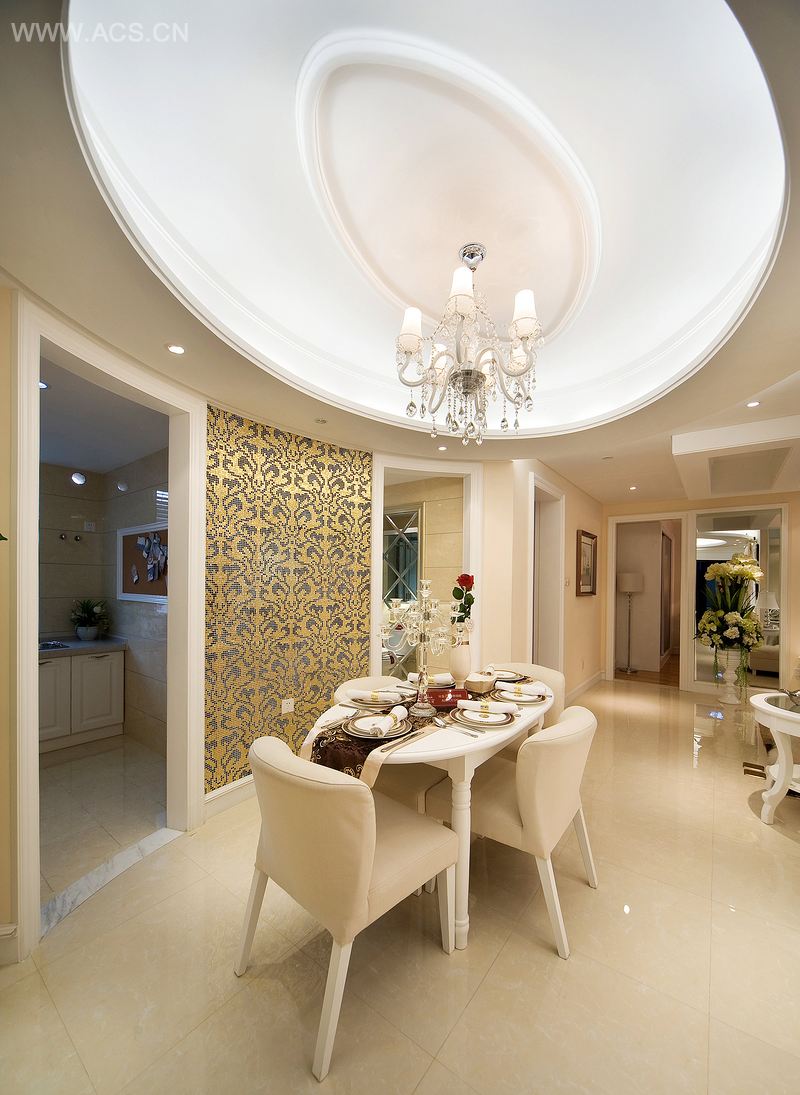整体采用米色、白色浅色系,灯光主要采用泛光形式,局部聚光,使得空间视觉更为宽敞。客厅的天花设计时随原阳台的梁而做处理,使得客厅的空间延展性更强。餐厅天地造型随平面形式,加强区域感。局部采用了银镜,营造奇妙的空间感觉。