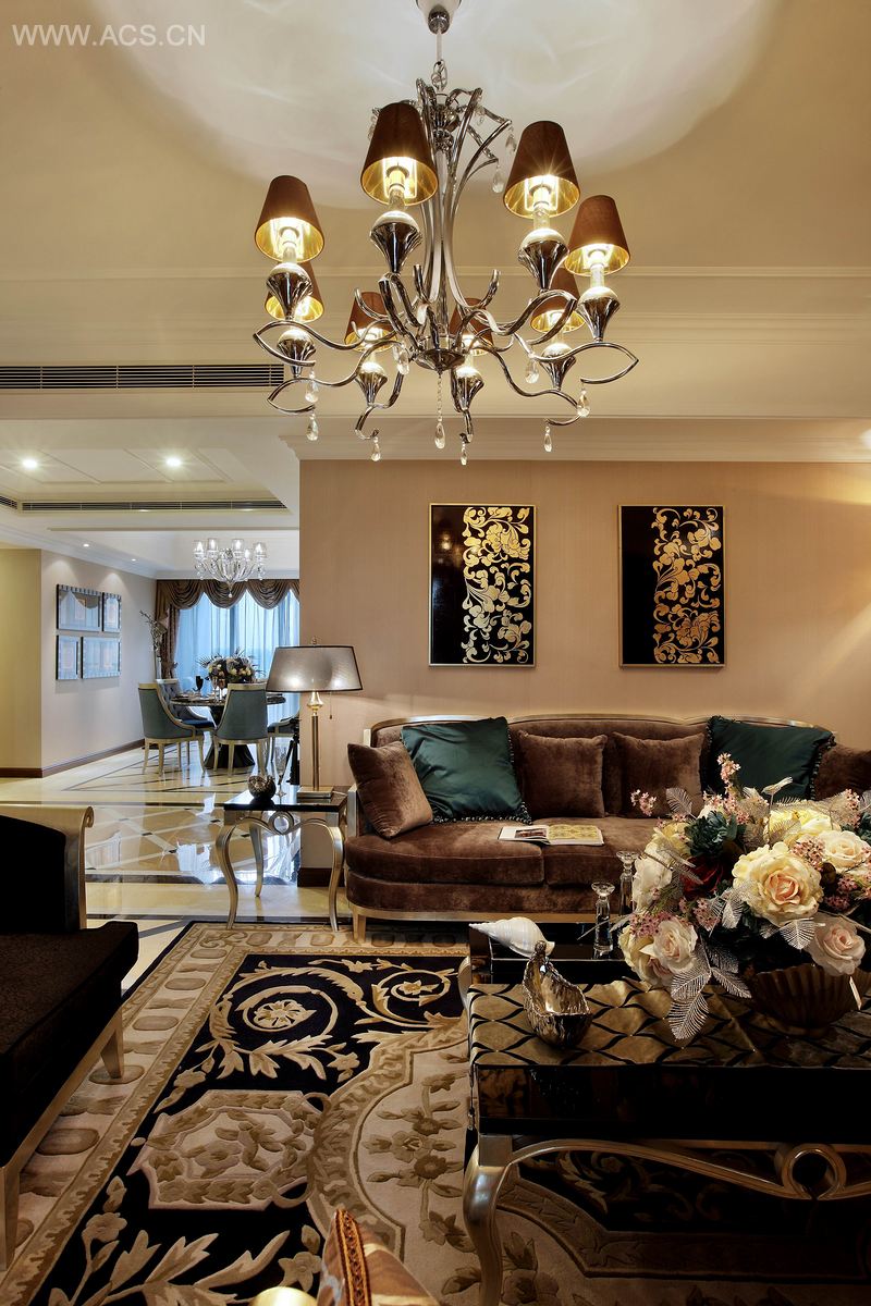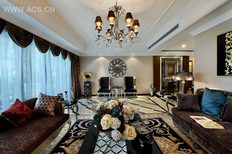 本案为新古典主义风格,奢华的洛可可风格充斥于整个室内的每个角落。设计师以棕色、黑色等色彩来奠定空间华贵沉稳的基调,空间内到处摆放金色、银色制品,增强空间的奢华氛围。