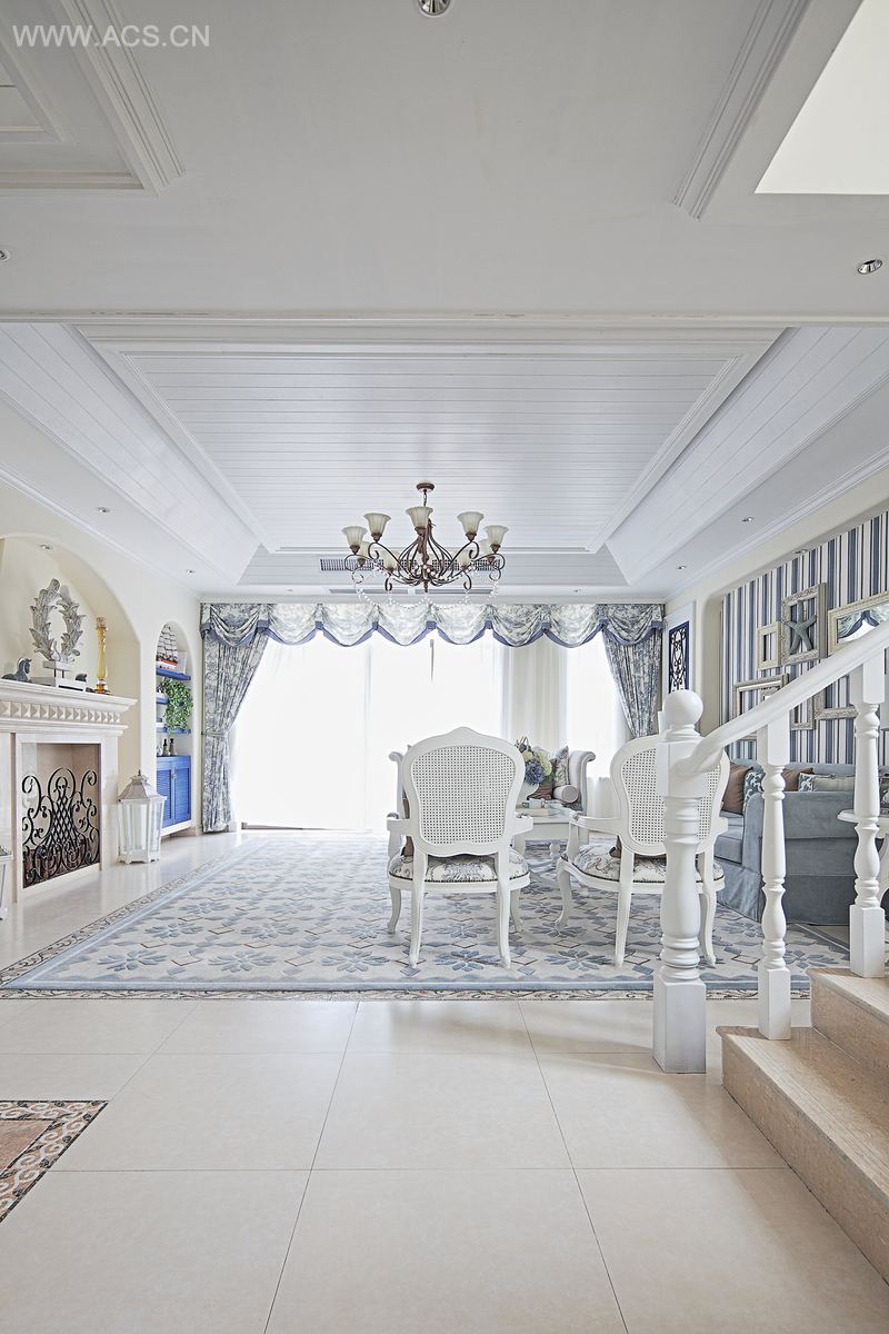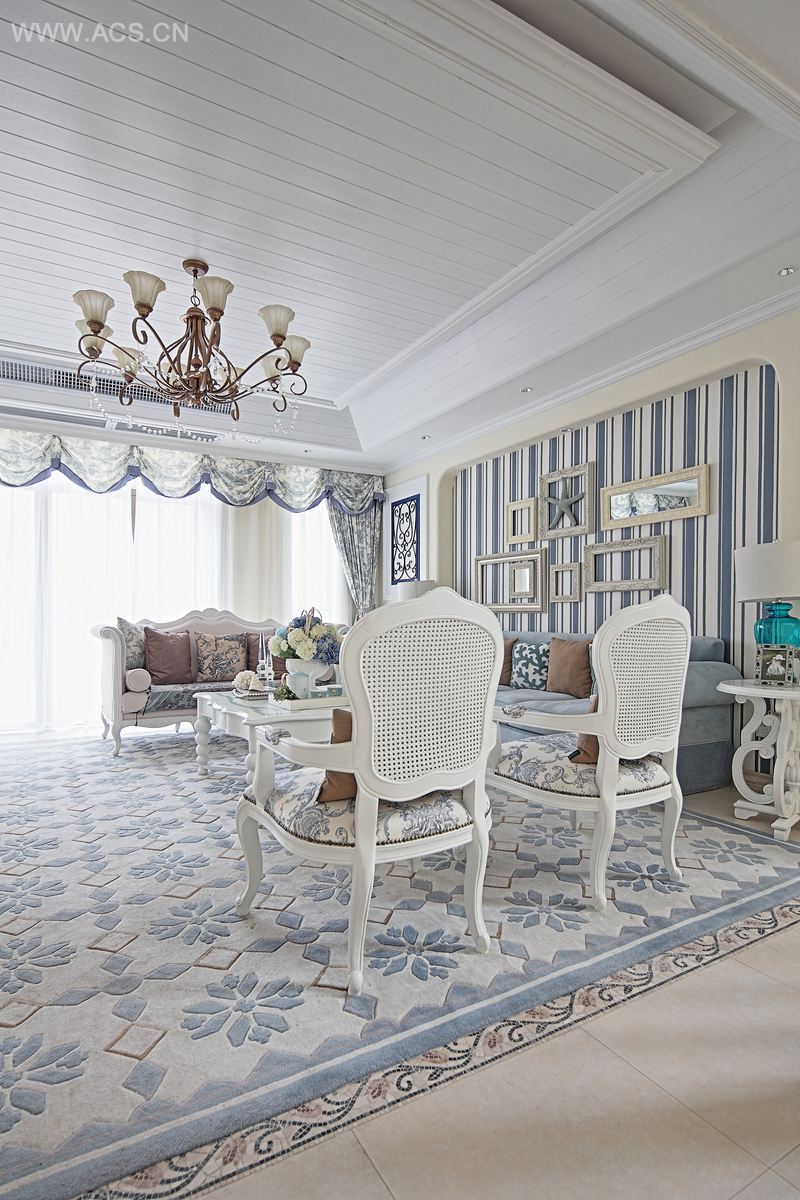 地中海浪漫的海水蓝、自然光的暖白色、大地的暖黄色及带有独特风味的工艺品是这个空间的主题表现。客厅、餐厅及主人房中,天花简洁竖向的实木线条与哑光面黄色仿古砖相呼应,并配予宽厚简洁的家具、地中海风情的地毯与布艺,将地中海风格表现的淋漓尽致,并延伸至其他的附属空间,呈现了地中海风情舒适闲逸的居住氛围。