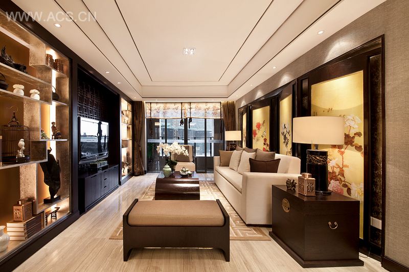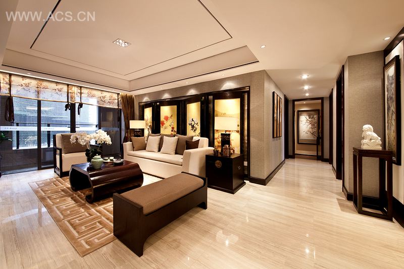 本案将中国文化施以现代手法给予表现,赋予深刻的文化内涵。整个空间沉稳大气、线条简练流畅,将水墨画中的茶花、鸟等中国元素引入家中,灰色的墙身、深色的木饰面韵味深远,古朴自然。玄关简单利索,宽阔的视觉空间、古雅的山茶花挂画、大胆跳跃的红色花瓶,一切都那么和谐舒适。开敞式的客厅、餐厅使空间通透明亮,古色古香的屏风、淡雅的君子兰、精雅的典藏饰品、家具简约的线条,诠释着主人的艺术品位。精致小巧的家具墙饰成为餐厅的亮点,在整个气氛和色调下,空间显得舒适温和。书房以简约优雅为主,以笔墨纸砚、书画石狮来体现浓郁的书香气息,无处丌在的境趣让你在其中享受无穷。主卧床头的山茶花挂画点亮主题,淡雅的床品、暖灰色墙身、深色木地板、使空间过渡自然,极富层次感。几上的陶瓷台灯、古雅的茶具、精美的装饰盒,都依稀可见东方韵味。主卫采用石材不镜子的设计为其增加了变化,充分利用材质特点,并非繁琐的饰品摆设,传达了视觉上的平衡。