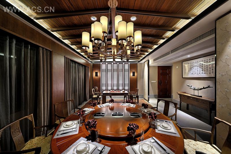 穿过青石、灰砖布置的古色走道,便进入大厅。这并不气派华丽大厅门面却透着简单随意的舒适。为让周边优美的自然景观引入室内空间,房间最大限度的留出了开窗面积,同时结合中国传统水墨画、中国传统工艺“三绝”福州脱胎漆器、根雕、漆画这些艺术品让空间赋予了更多的人文气息。在这里,人们在品尝着精致菜肴的同时感知着传统艺术的悠远内涵。