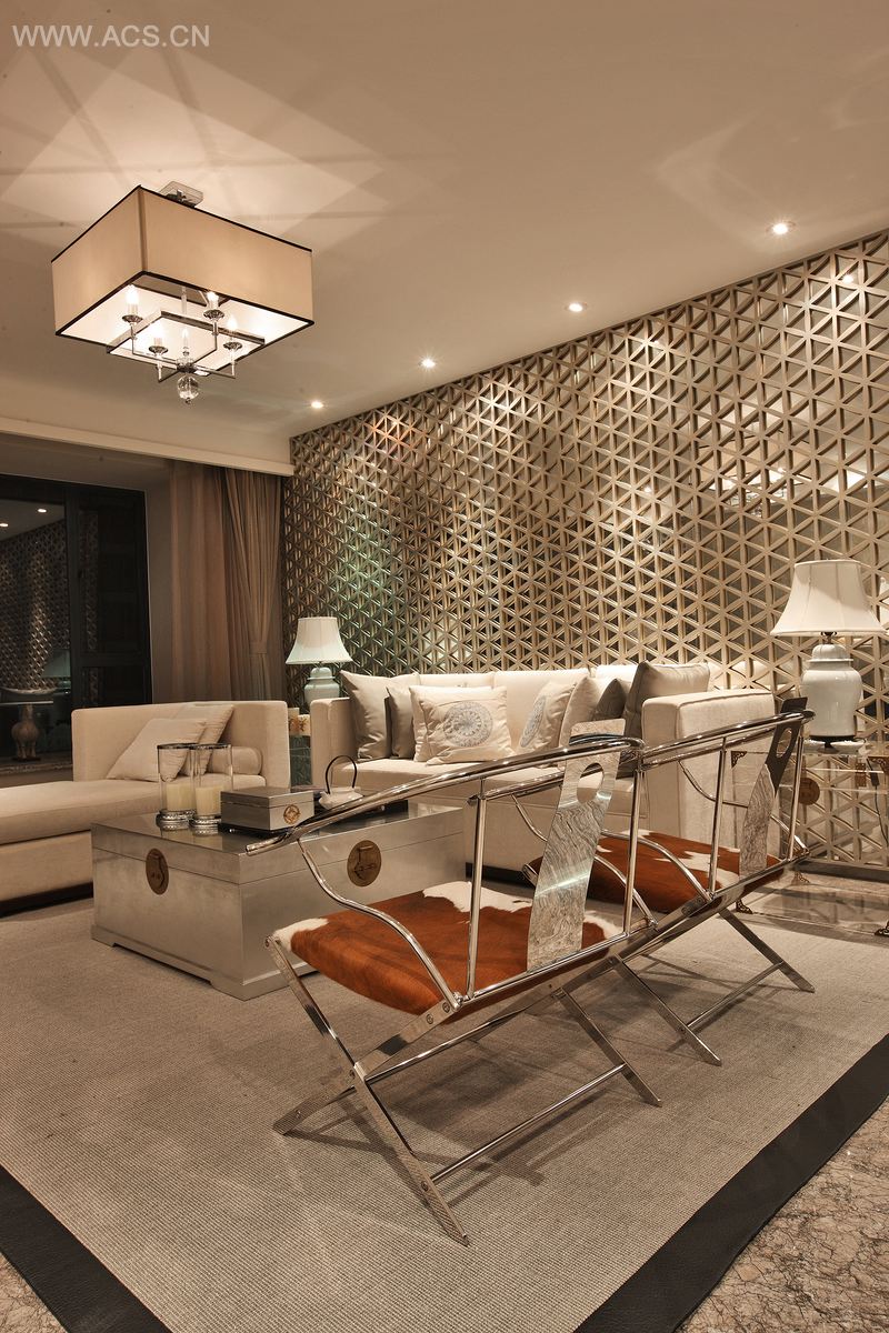本案是面积达200多平方米的大户型样板房。以中式风格为主体,让其彰显以优雅细腻的中国文化为底蕴,且不失奢华,高贵。在餐厅用了暗红色的皮革硬包,采用中国的刺绣的模式,勾勒抽象的花型,彰显贵气,客厅使用了香槟银的色调,把中式的型用另一种色调诠释,花格配镜面,香槟配银色;用线条花格,勾勒整个画面,生动的塑造精炼而高雅的生活格调。