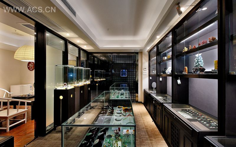 作为一处翡翠、玉石的展厅及销售会所,空间本身的设计必须是内敛不张扬,制造一个玉器展览文化氛围的承托平台,其绿叶效果似乎更为契合主题。在这个展厅里,复古中式的陈列柜与玻璃组合,搭配明亮的白光和棕色复古地板,四壁涂白不雕饰,中间展台为零散小物件展区,琳琅满目的藏品整齐有致地排列着。置身其间,沉静自在,与外面的喧嚣浮尘相比,这儿似乎满载着岁月的沉淀感。