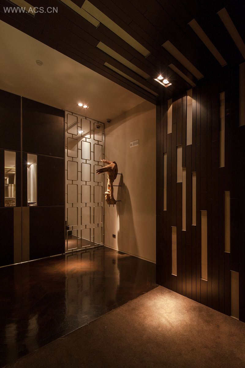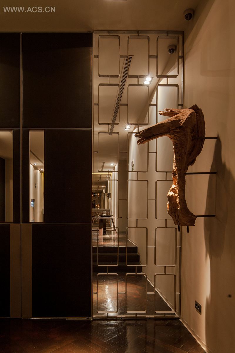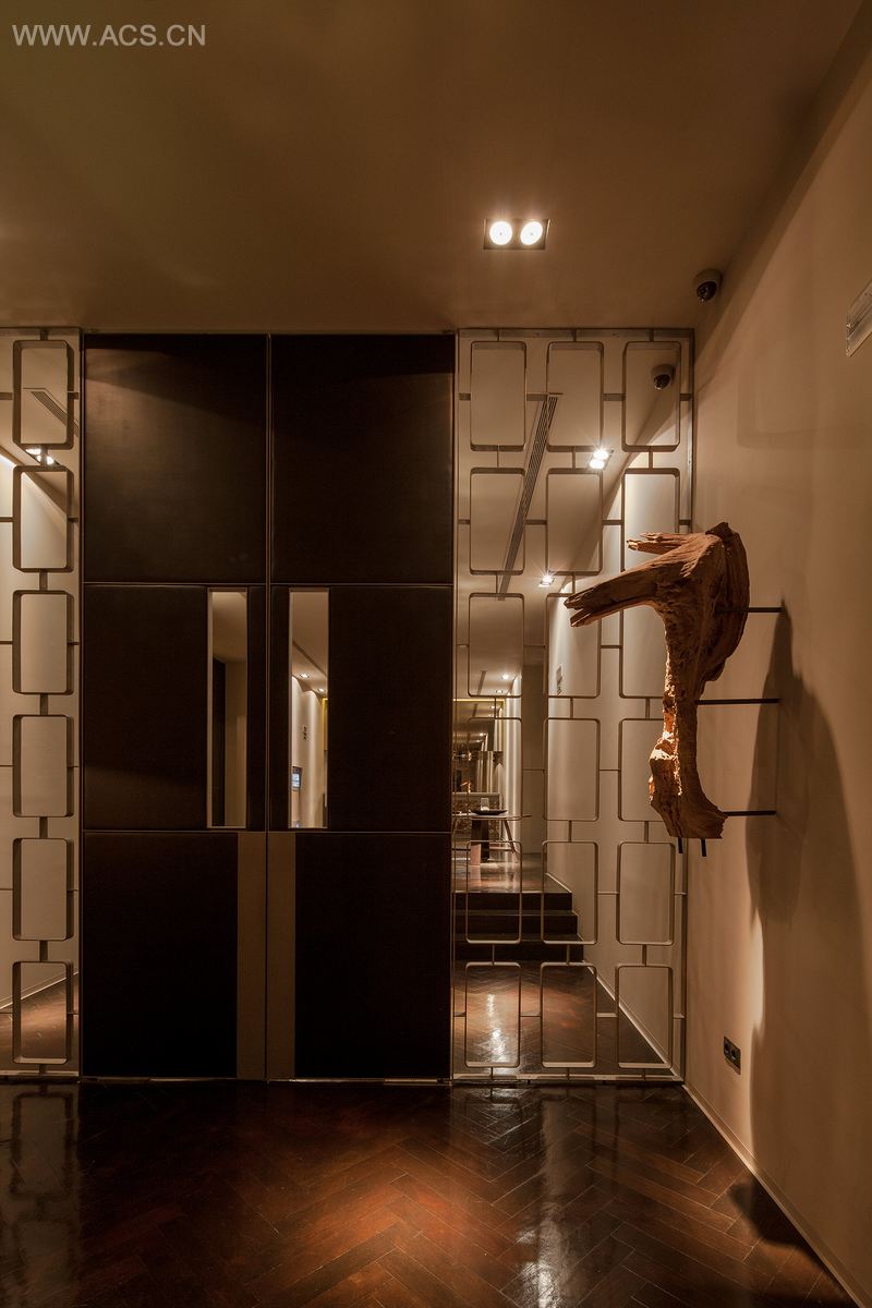 大厅的入口非常具有当代风格,简易的中式连续花纹的金属镂空屏风与现代的木质大门组合成一个透空的屏障,在空间隔开的形式上,屋里屋外形成了视觉和空间上的延伸。同时入口墙上的原始木雕增加了一丝趣味和灵动。