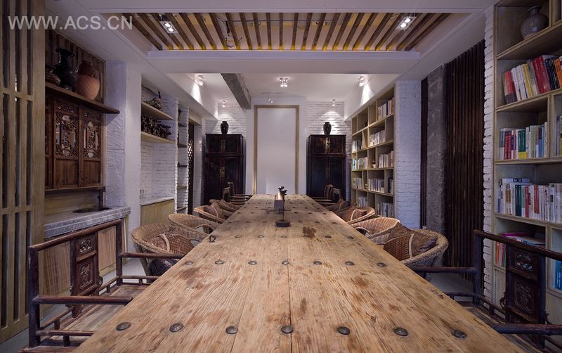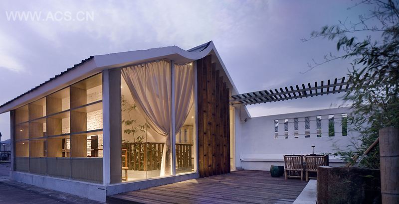 设计中采用中国传统相互借景等园林式手法,寻找自然协调舒适的环境。另一个亮点还在于书吧的屋顶处理,简单的月牙式屋顶和原顶天井的应用,是对徽派建筑的诠释,也是一种平民话的语言,使人们得到最大限度的放松。